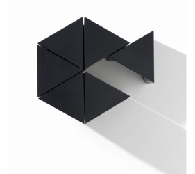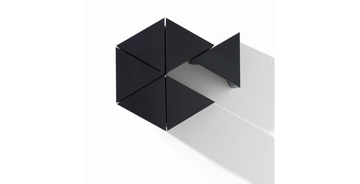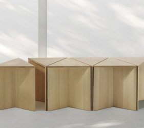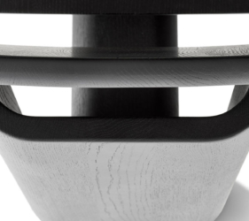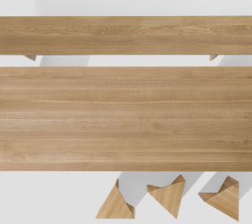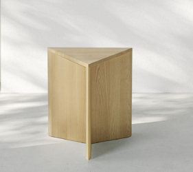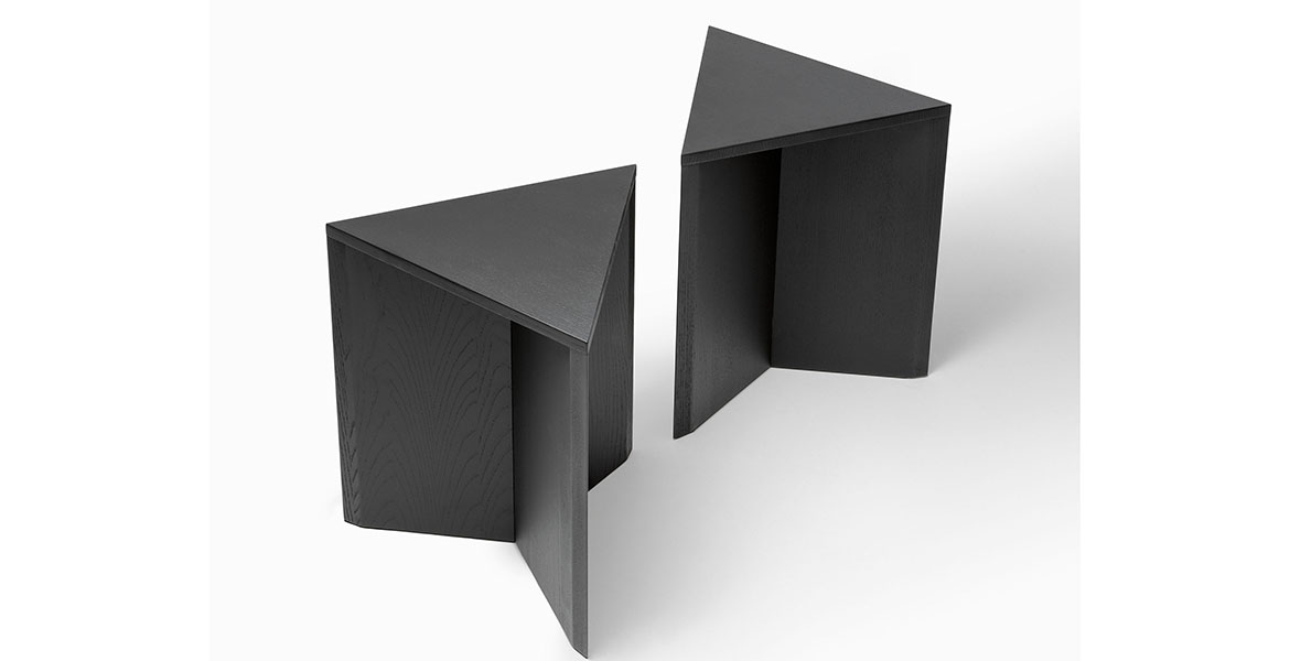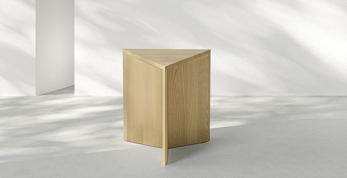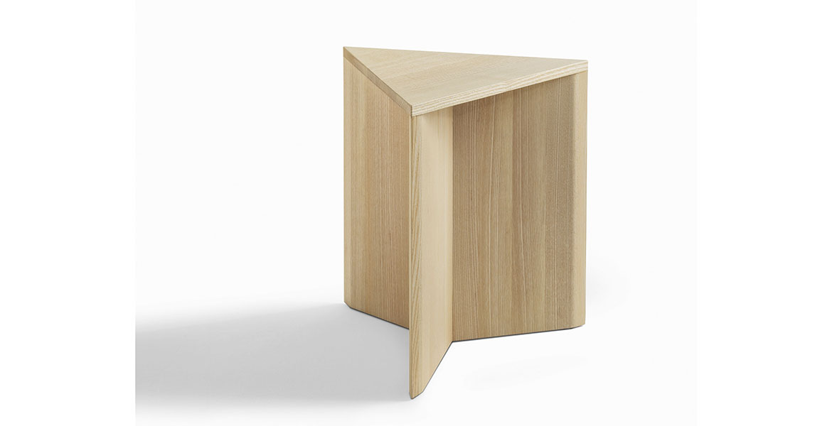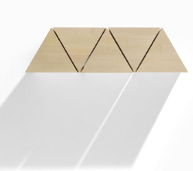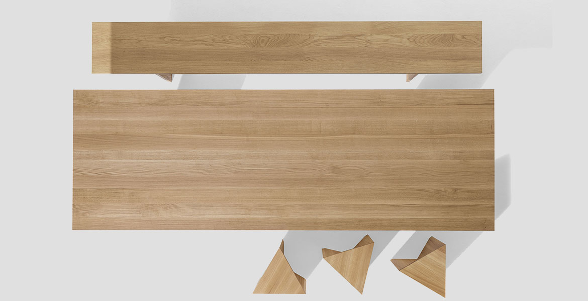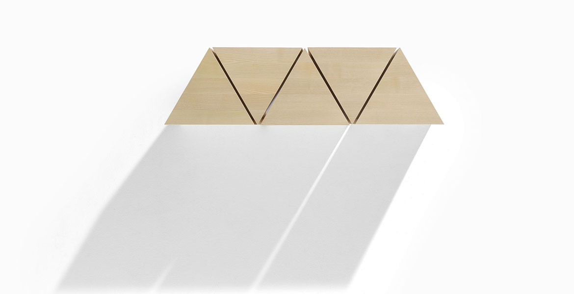 De driehoekige vorm genereert talloze spelmomenten van lijnen, diktes en oppervlakken, wat eveneens oneindige compositiemogelijkheden biedt. Volledig vervaardigd uit eiken- of essenhout, is het een voorbeeld van hoe een natuurlijk materiaal een project op zich kan worden.