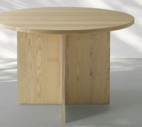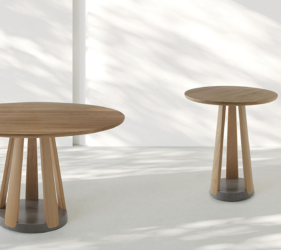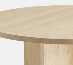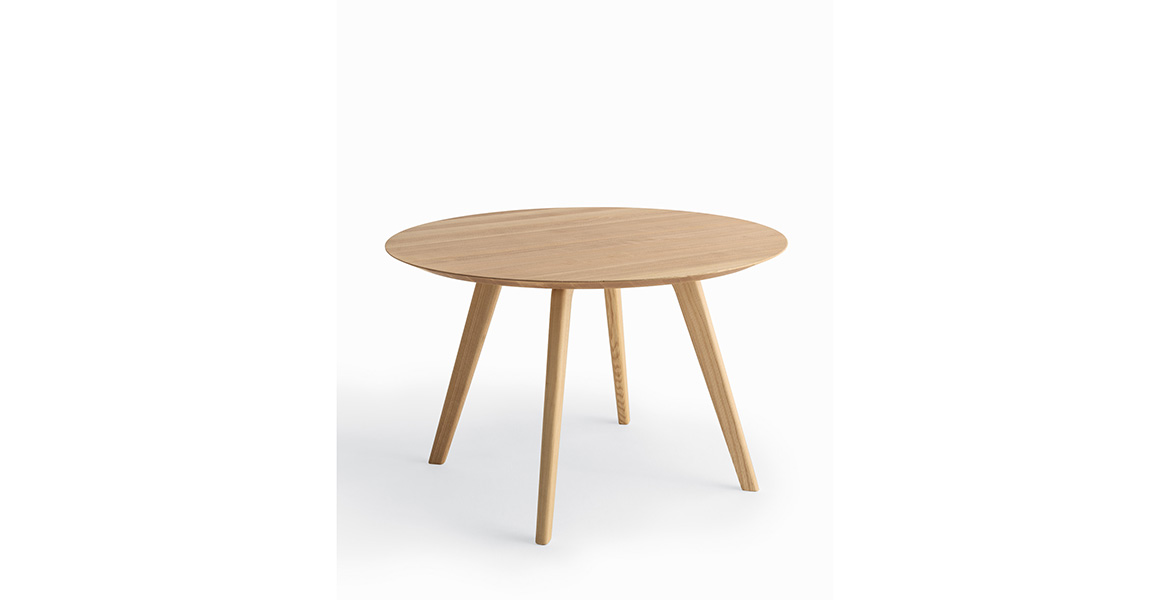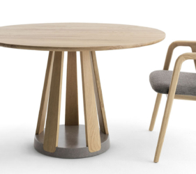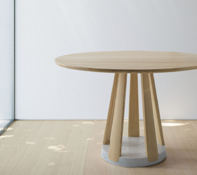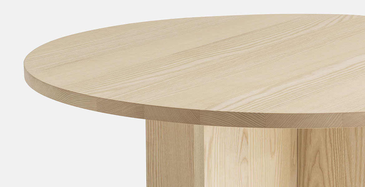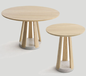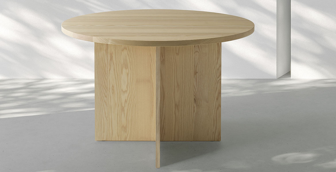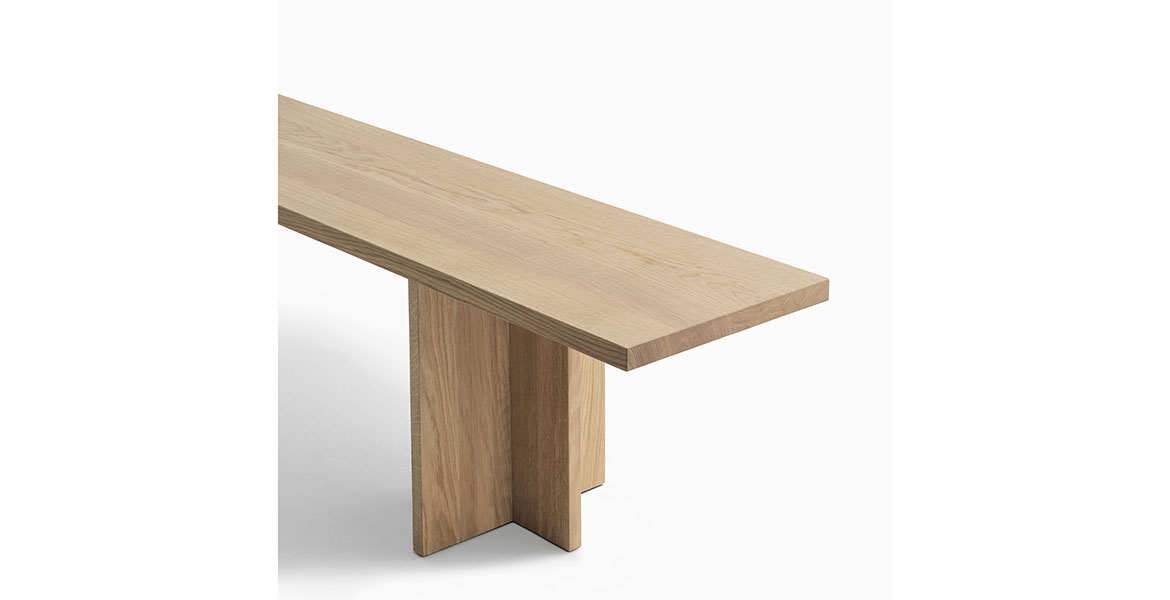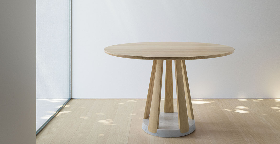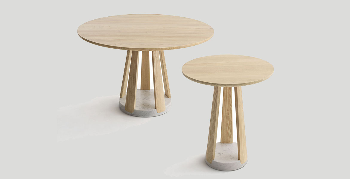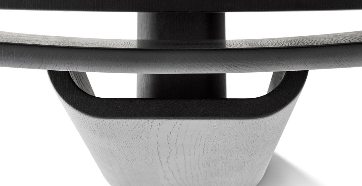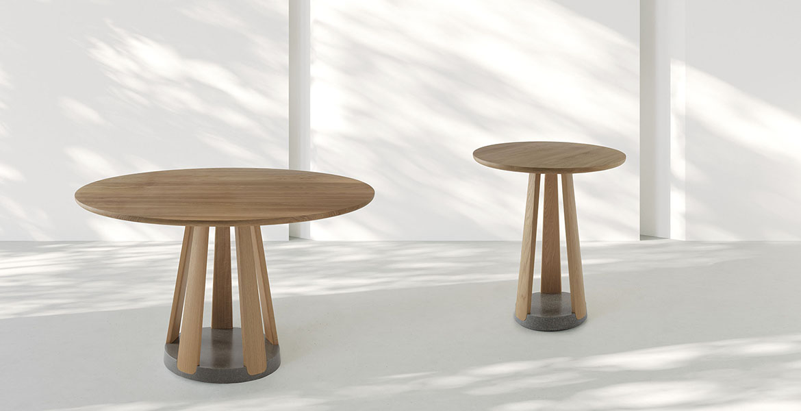 Het ronde blad wordt ondersteund door een reeks elementen die een ritme van massieve en open vormen creëren. De tafel is verkrijgbaar in twee maten en is gemaakt van eikenhout of essenhout, met een onderstel van Carrara-marmer of Piasentina-steen dat zorgt voor stabiliteit, geheel in lijn met de Passoni “Natural Culture”-filosofie.