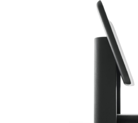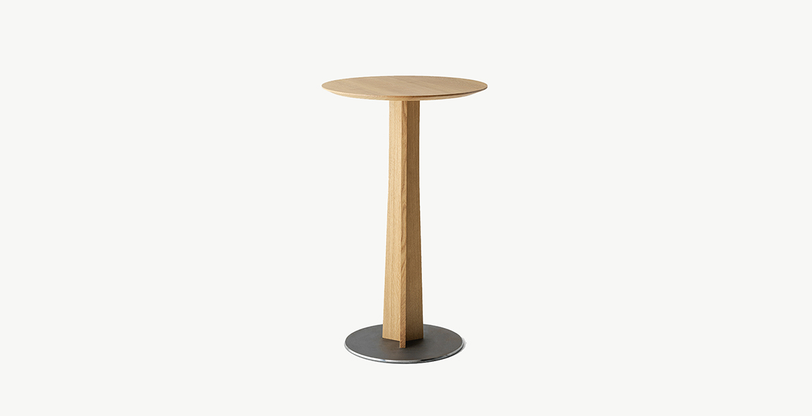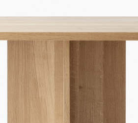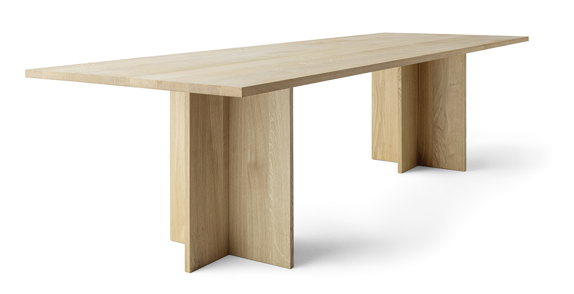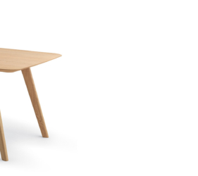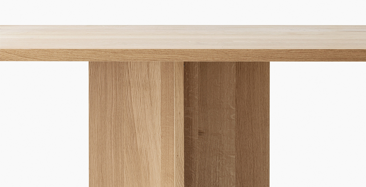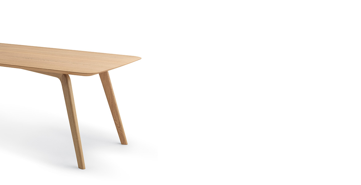 De uitlopende dikte van het tafelblad geeft een gevoel van visuele lichtheid, terwijl de schuine poten bijdragen aan een dynamisch evenwicht tussen de vormen.
