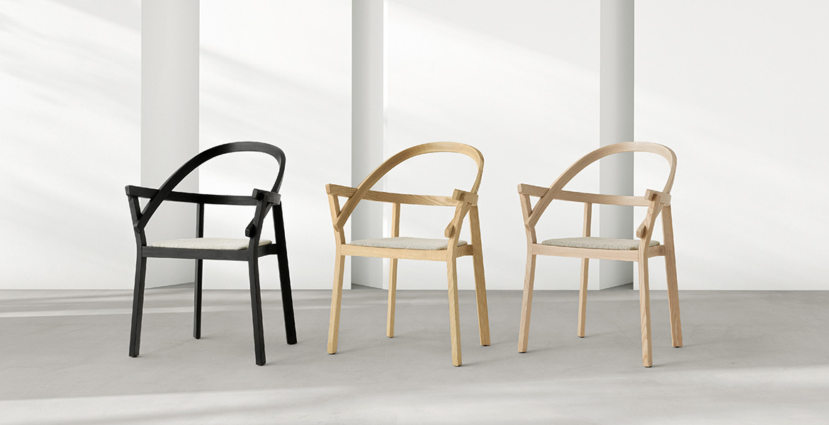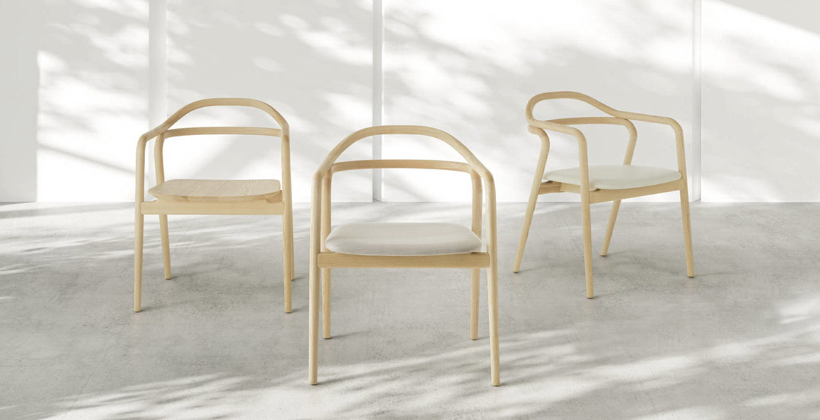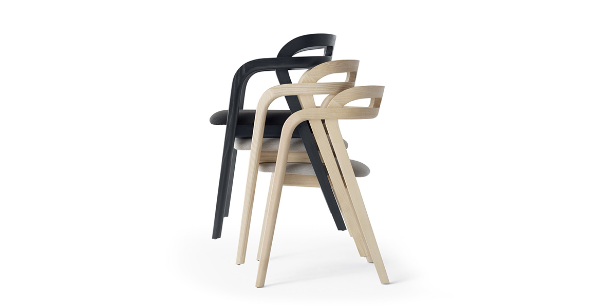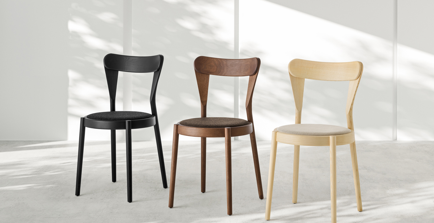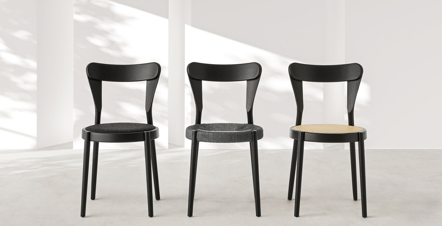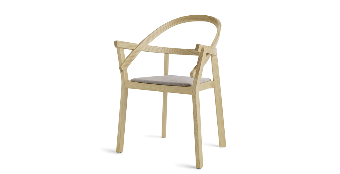 Het lichtgewicht frame van de stoel is gemaakt van massief essenhout (natuurlijk of gelakt) en de zitting is verkrijgbaar in 3 uitvoeringen – touw, Weens riet en textielbekleding – waardoor de stoel veelzijdig in diverse interieurs past.