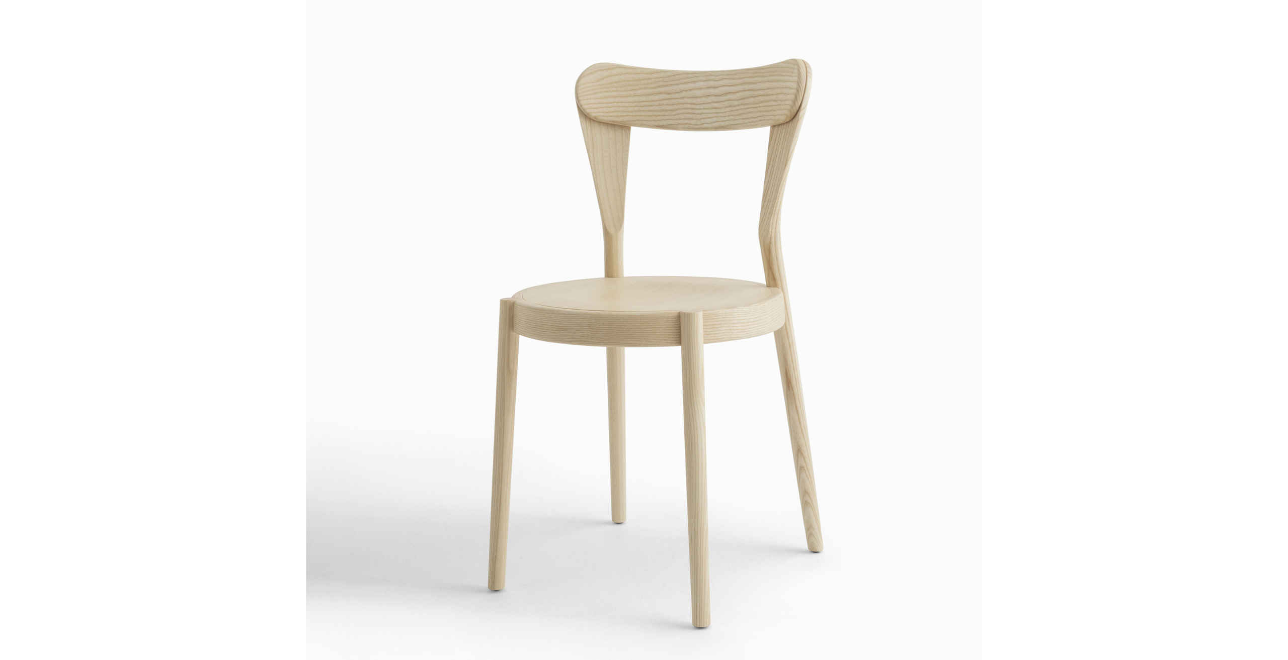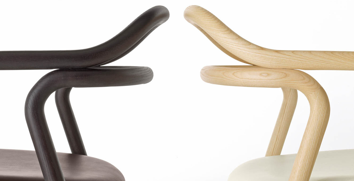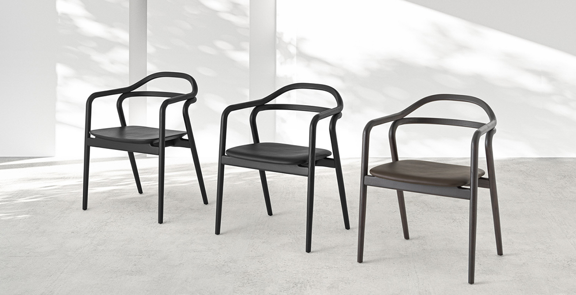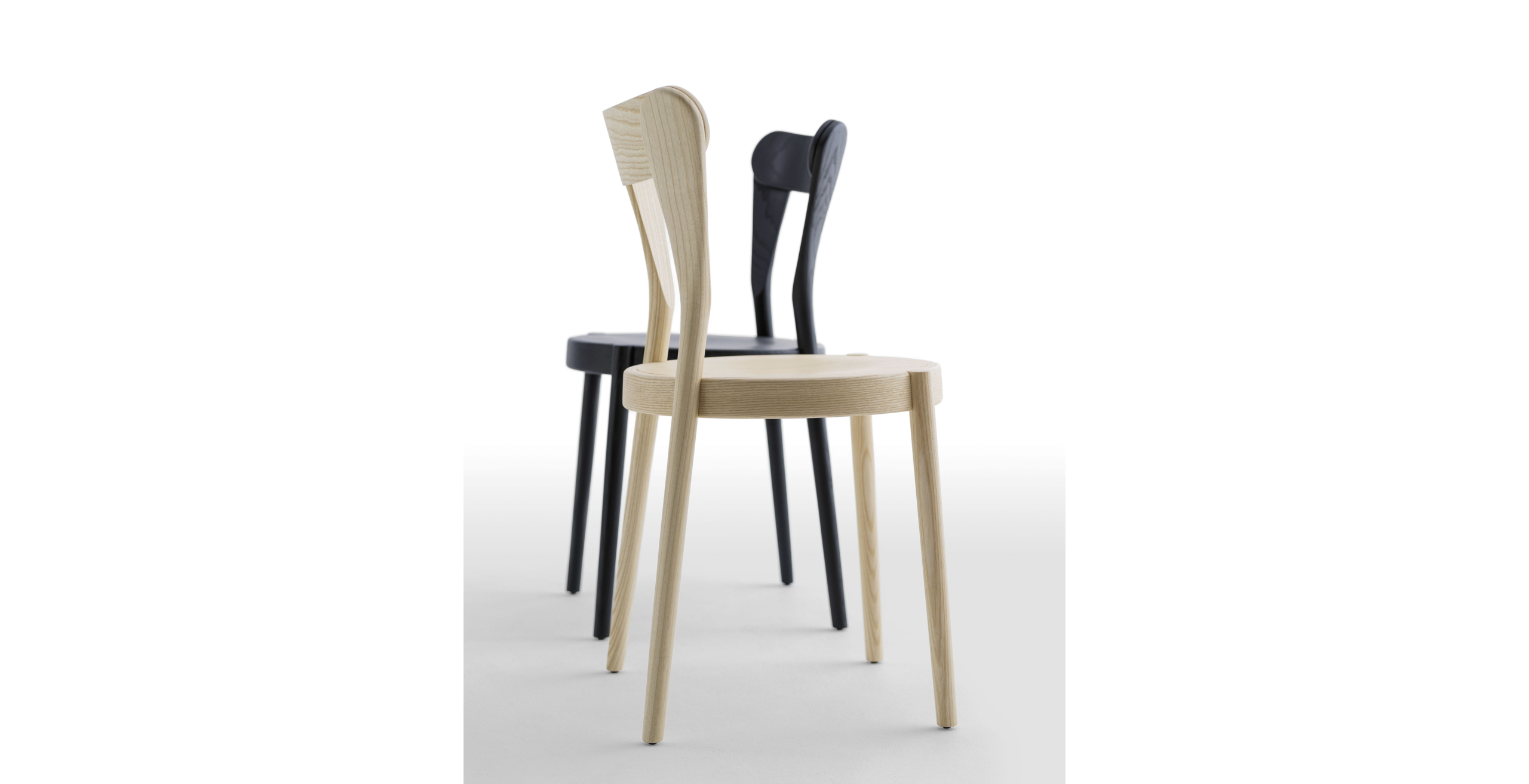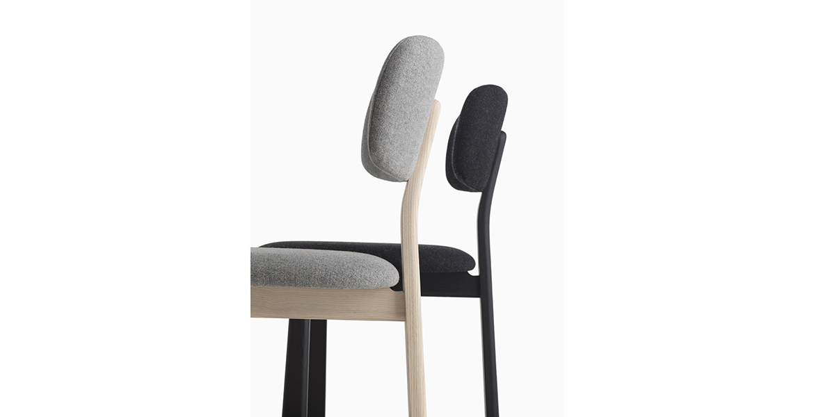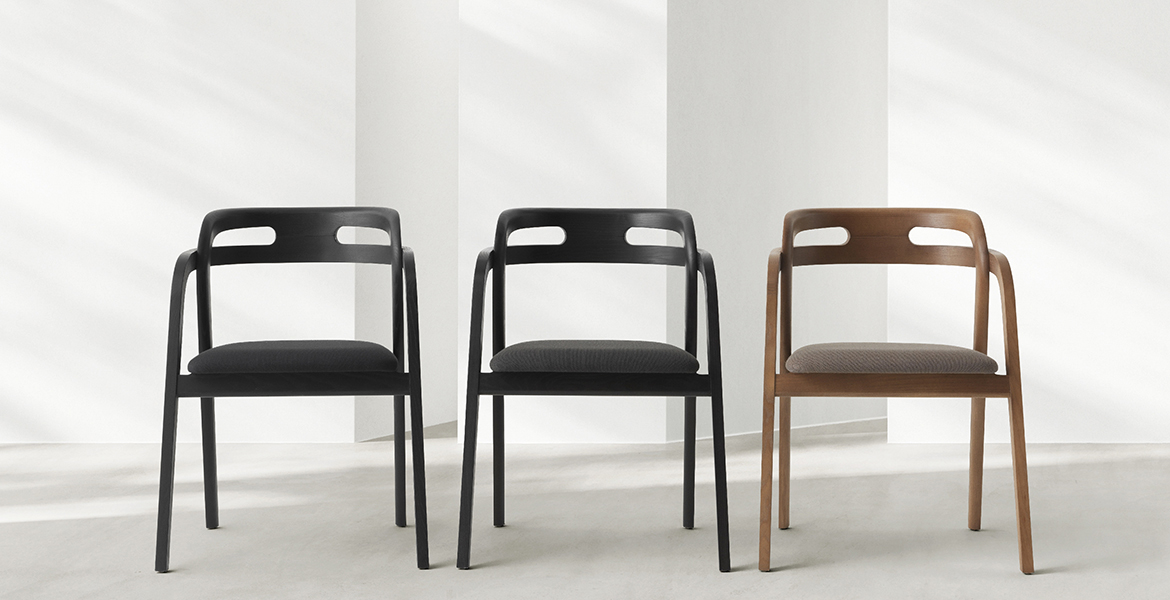 Het lichtgewicht frame van de stoel is gemaakt van massief essenhout (natuurlijk of gelakt) en de zitting is verkrijgbaar in 3 uitvoeringen – touw, Weens riet en textielbekleding – waardoor de stoel veelzijdig in diverse interieurs past.
