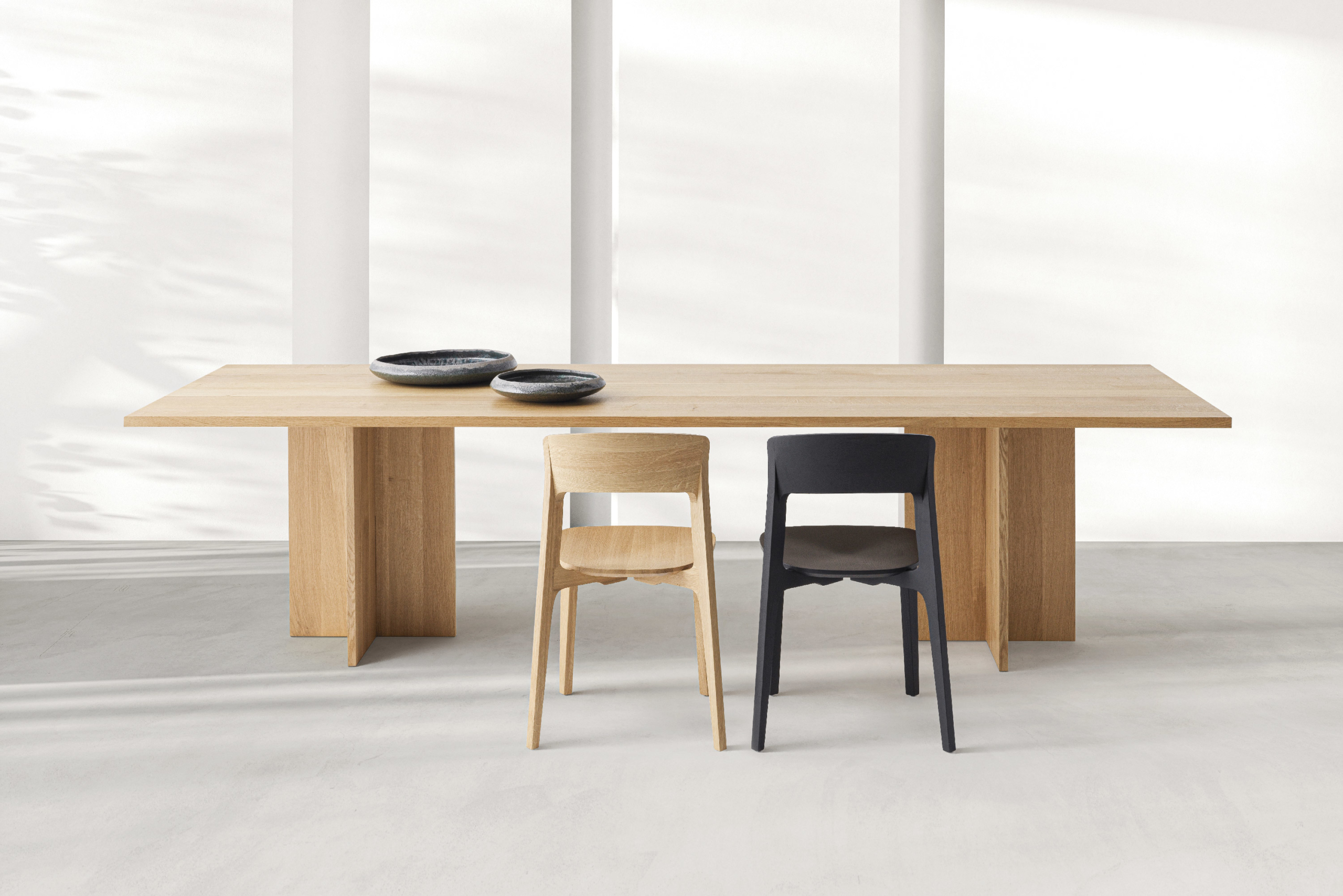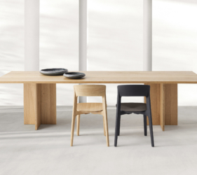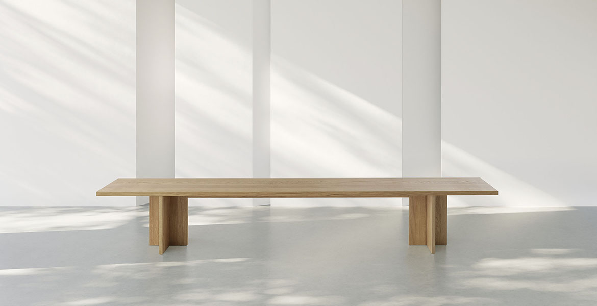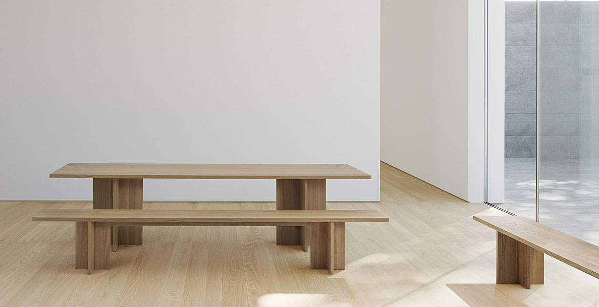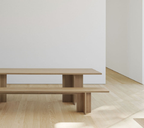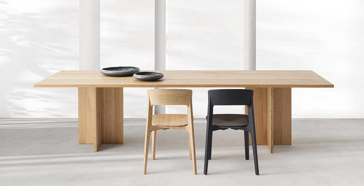 De Doga-tafel combineert hout en steen in een uitgebalanceerde harmonie van proporties.