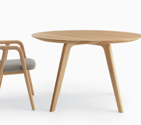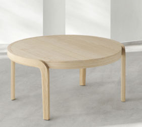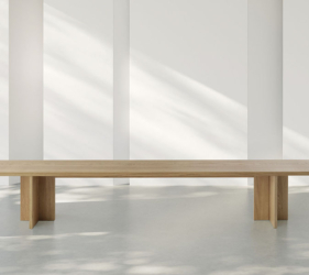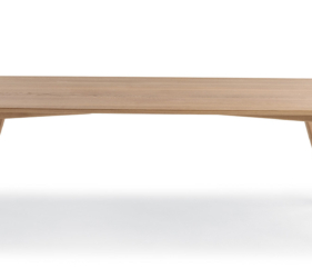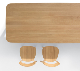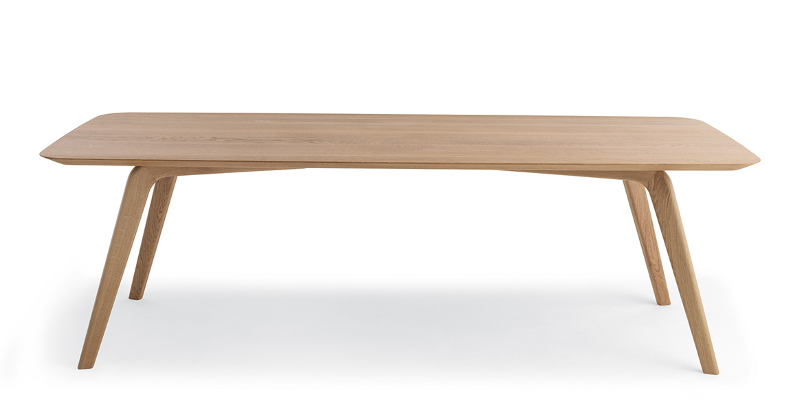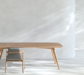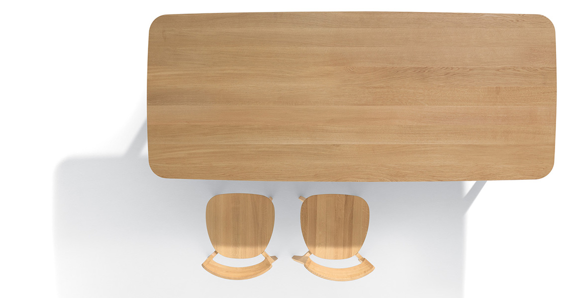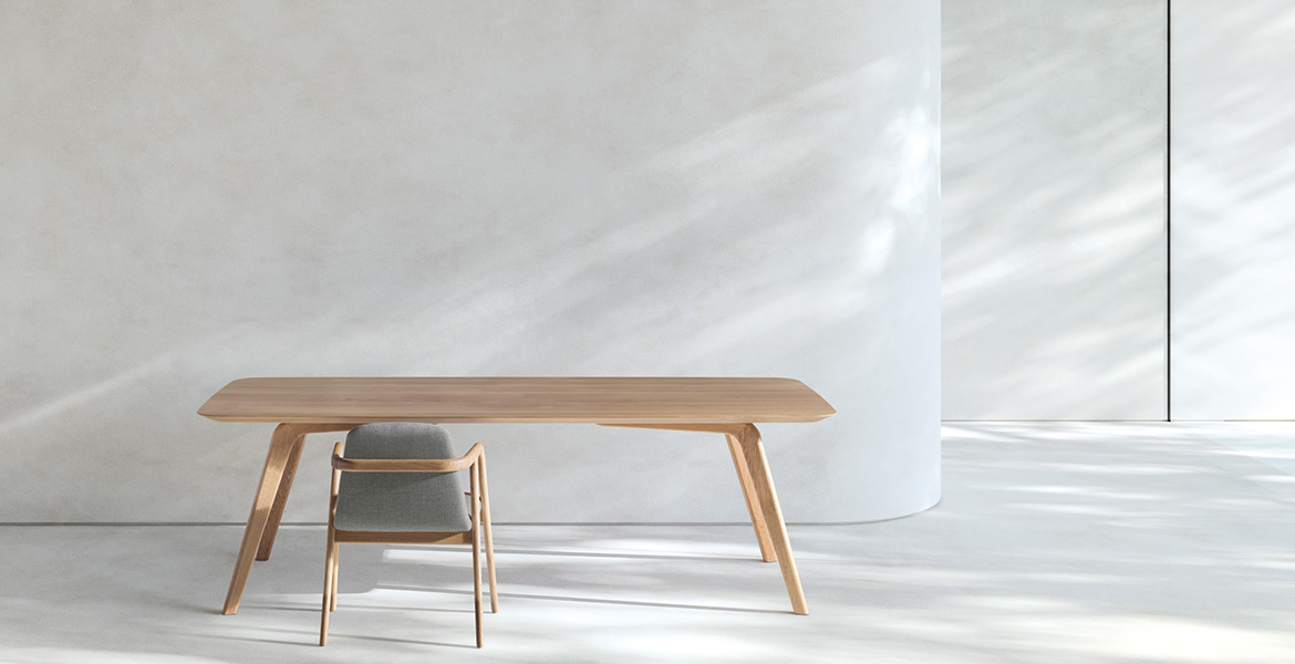 De Rice-tafel, gekenmerkt door zachte en harmonieuze lijnen, getuigt van verfijnd esthetisch onderzoek en diepgaande expertise in het bewerken van massief hout.