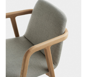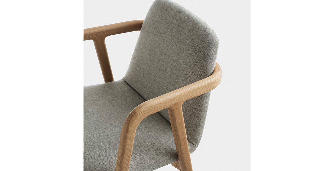 Het houten frame met vloeiende randen en de zachte bekleding benadrukken het comfortabele zitcomfort.